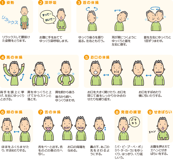 「パ・タ・カ・ラ」と発音することで、唇や舌を動かします。唇、舌の動きを目的別にトレーニングします。せきばらい