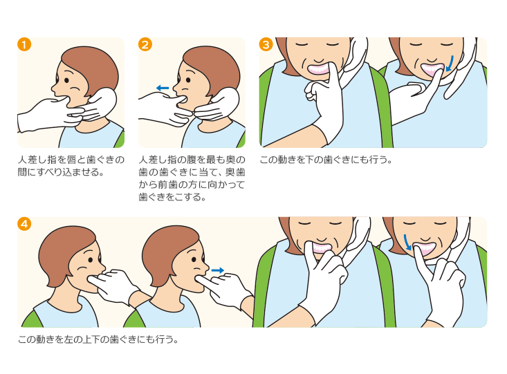 口腔ケアの器具が手元にない場合や、お口のまわりの筋肉が硬いために、スポンジブラシでは柄が曲がってしまって、うまく行えない場合に「ガムラビング」を行います。