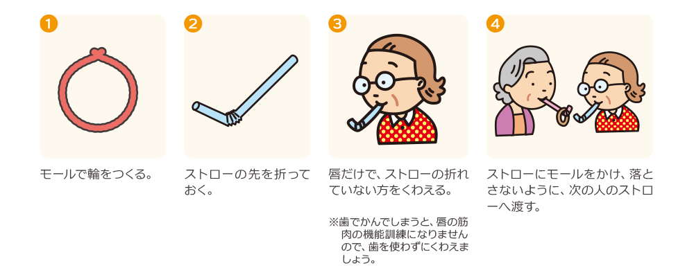手を使わずに、唇やそのまわりの筋肉の力だけでモールをリレーするこのレクリエーションは、唇を閉じる力をつけることができます。