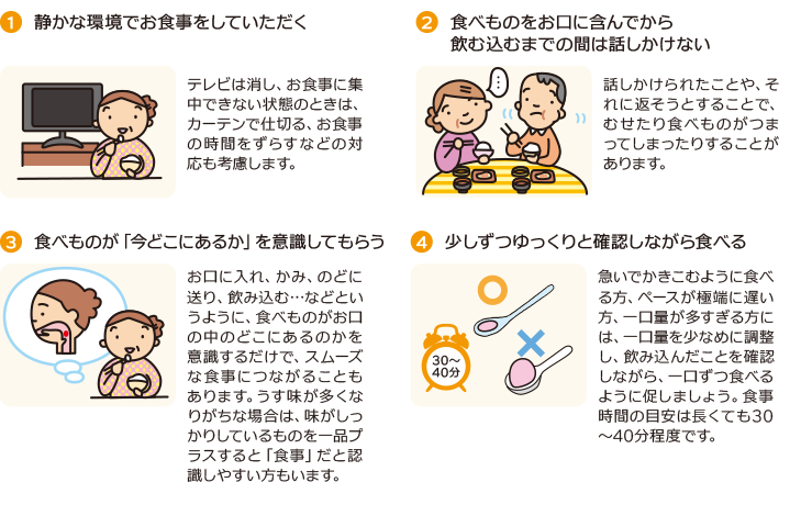 誤嚥を予防するためには、お食事をする環境を整えることがとても大切です。