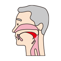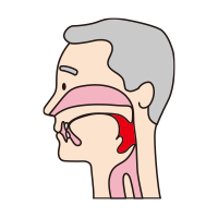 舌の運動により、かたまりになった食べものは、舌の後方へと送られます。舌の奥までくると、舌の付け根と軟口蓋(なんこうがい:鼻へ通じるドア)の間を通過して、のどへと送り込まれます。