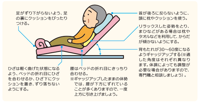 背もたれが30~60度になるようギャッジアップ(ベッドの頭や足を持ち上げて角度をつけること)する。